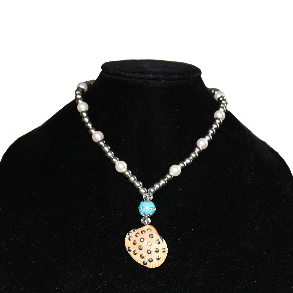 Safe Haven Handmade Turquoise Bead & Rhinestone Embellished Seashell Pendant Choker Necklace