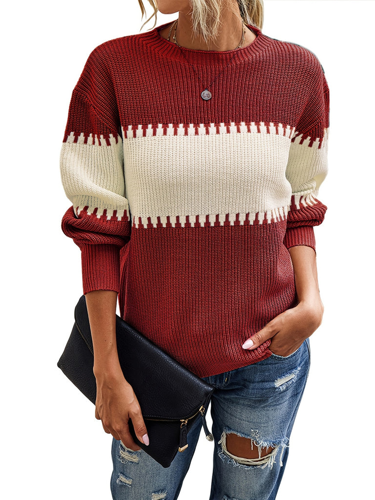Color Block Long Sleeve Round Neck Sweater, Loose Autumn & Winter Comfy Sweater, Women's Clothing