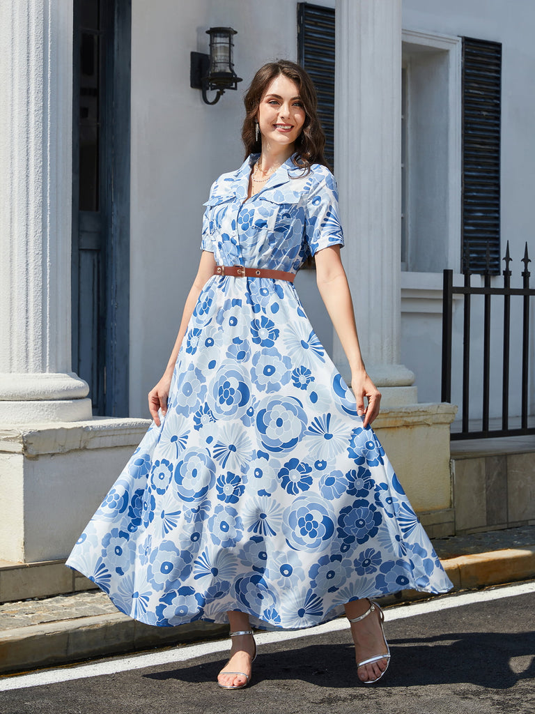Floral Print Lapel Collar Short Sleeve Maxi Dress