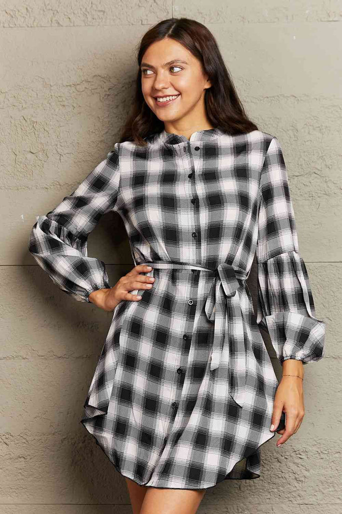 Plaid Tie Waist Lantern Sleeve Mini Dress