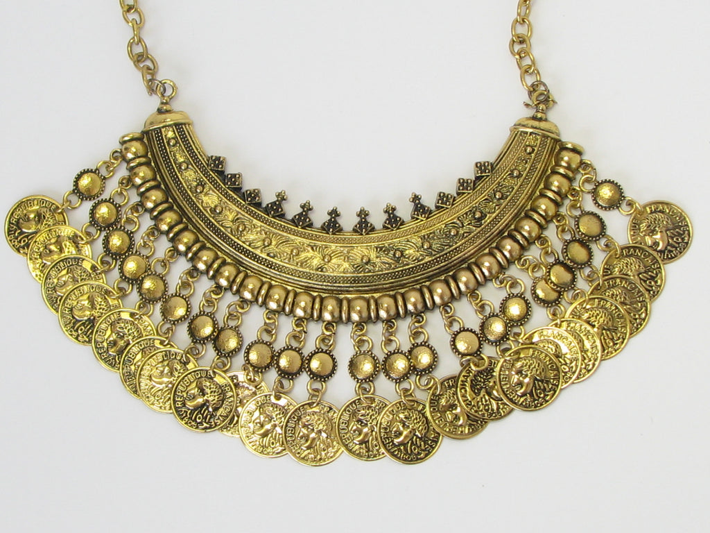 This Turkish Gold Coin Metallic Tribal Ethnic Chunky Bib Choker Statement Necklace is a jewelry made of gold alloy with vintage tribal tassel coin charms design.